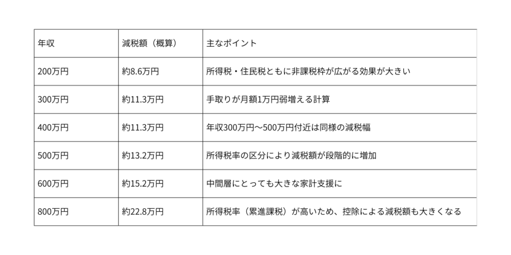 実際にどのくらい手取りが増えるのか、国民民主党が試算している目安を見てみましょう。