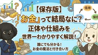 お金の知識 【保存版】「お金」って結局何?正体や仕組みをわかりやすく解説! 「お金って何?」そんな疑問を世界一わかりやすく解説!お金の正体は「紙」ではなく「信用」です。お金が持つ3つの魔法(機能)や、キャッシュレス・仮想通貨などの現代の仕組みまで、初心者でも3分で本質が理解できる内容です。お金の不安を解消しましょう。 2025.11.27 お金の知識